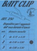 BAIT CLIP Il potere frenante di ogni calamento che si muove scomposto durante il volo riduce sensibilmente le distanze raggiunte. Il BAIT CLIP è il dispositivo per l'aggancio dell'esca durante il lancio, di facile e veloce montaggio. Impedisce al finale di muoversi, protegge l'esca permettendo un lancio più lungo. In tre misure proporzionate al diametro dello SHOCK LEADER. |