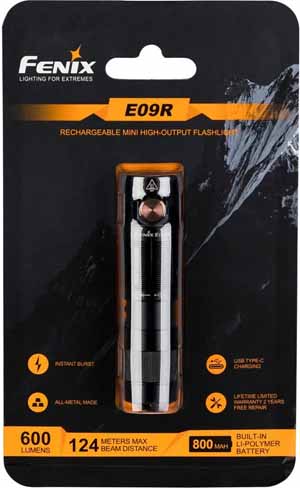 FENIX E09R FENIX E09R è una mini torcia ricaricabile ad alta potenza. Può emettere fino a 600 lumen dalla batteria integrata ai polimeri di litio da 800 mAh e ha un raggio d’azione fino a 139 metri. Ricaricabile rapidamente tramite la porta di ricarica USB Tipo-C, l’E09R ha un’autonomia massima di 70 ore. I quattro livelli di luminosità sono selezionabili con una semplice rotazione dell’interruttore laterale. L’E09R è il compromesso perfetto tra potenza e dimensioni ridotte, che lo rendono facile da portare con sé ovunque.
